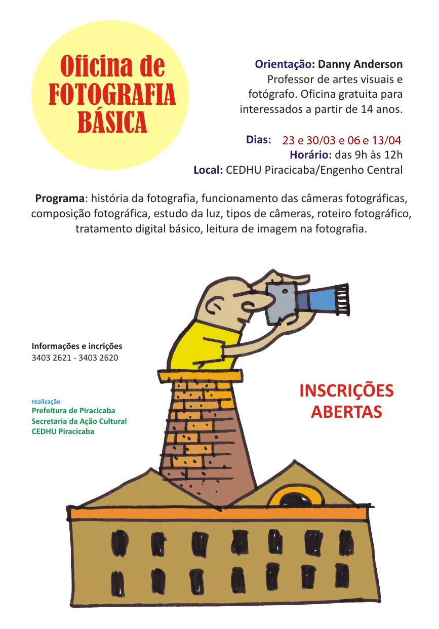 Professor de artes visuais e fotógrafo, Danny irá abordar assuntos como a história da fotografia, funcionamento das câmeras, estudo de luz, tipos de câmera, roteiro fotográfico, tratamento digital básico, leitura de imagem na fotografia, além de aulas práticas no melhor lugar para se tirar fotos na cidade: o Engenho Central!